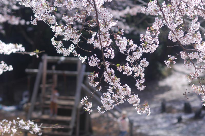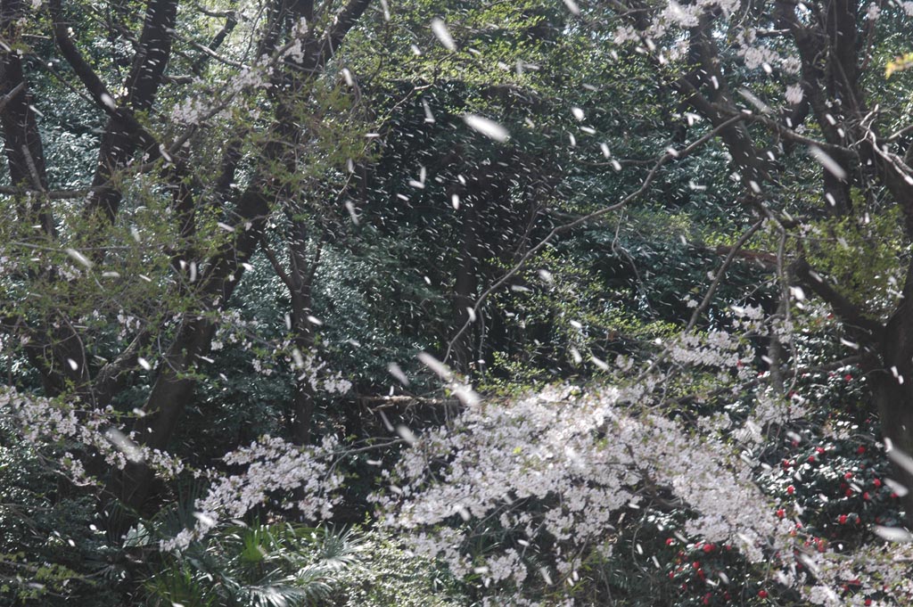 裏にある弥生神社にて終わりかけの桜を撮った。風が強くものすごい桜吹雪! 予想外に面白い写真が撮れた。