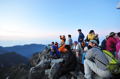 槍ヶ岳山荘前で記念撮影 奥の槍は渋滞しているのがわかりますか?