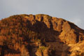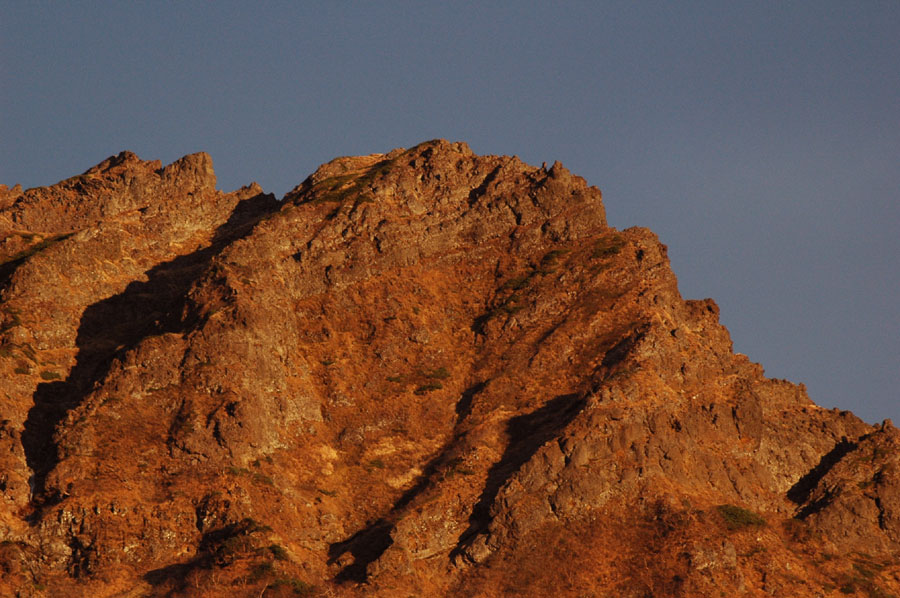 | 夕焼けに染まる岩肌。超望遠で手持ちは厳しいため感度大幅アップして撮影 |