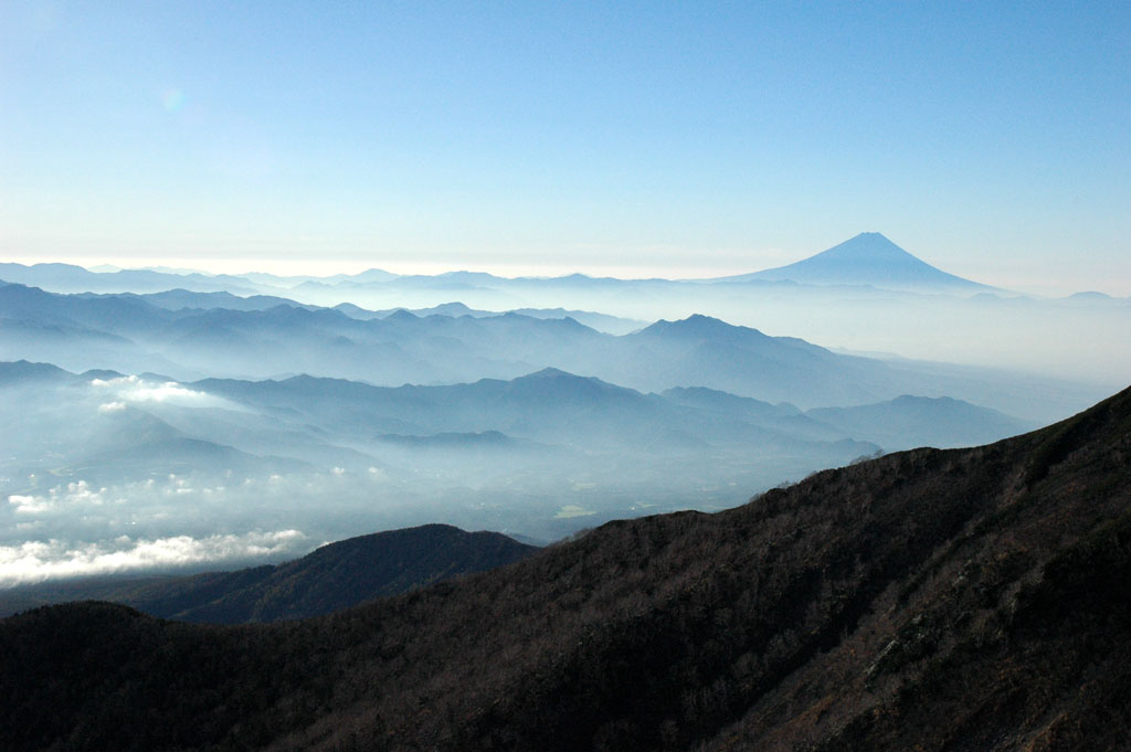 山脈の向こうに見える富士。 |