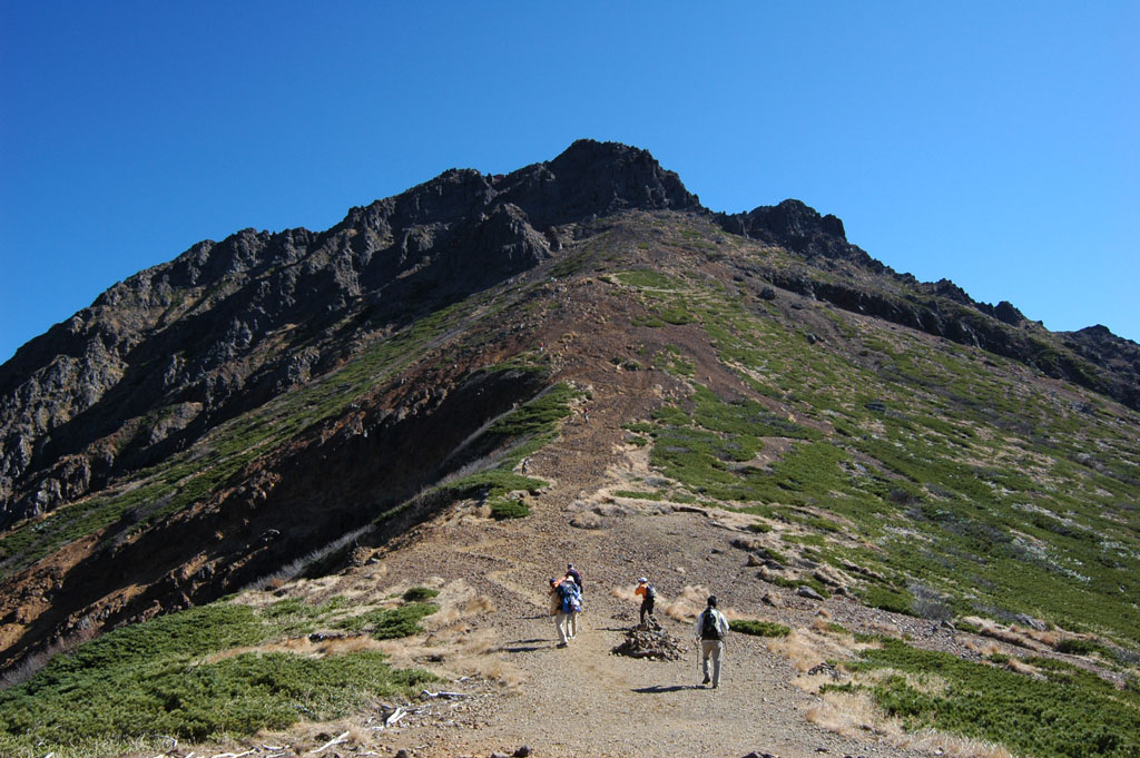 赤岳周辺は岩場の連続。 |