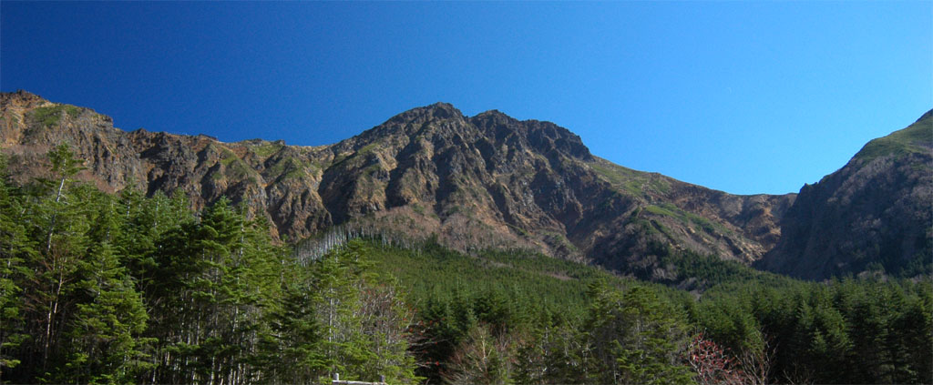 | 行者小屋付近から撮った赤岳。厳しい岩稜具合がわかる。 |